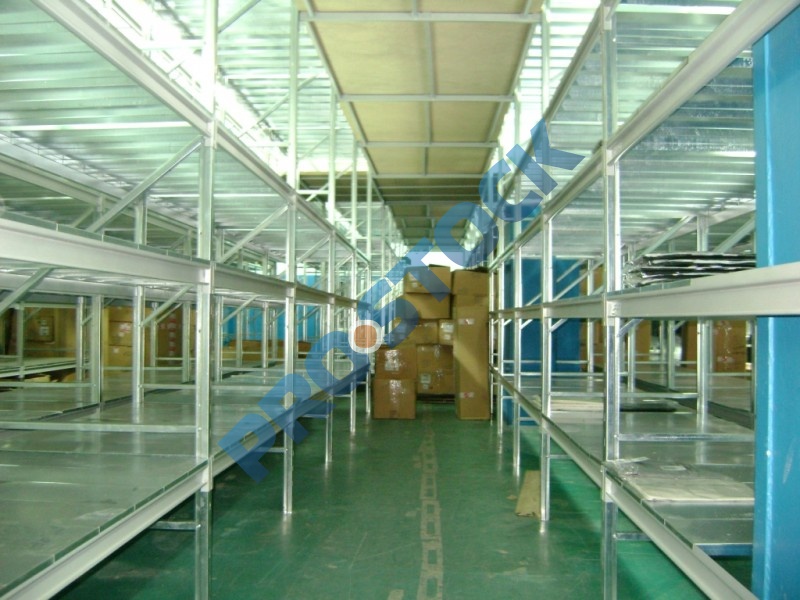 Сегодня полочный мезонин складской является одной из самых распространённых конструкций. Его монтируют на специальные стойки, соединённые между собой горизонтальными либо же диагональными стяжками. В результате образуется рама, сверху которой крепится полка, выполненная из листа металла, либо ДСП. Наиболее практичным вариантом является металлическая полка – она более вынослива, долго сохраняет первоначальный вид, не прогибается. Это оптимальное решение для размещения тяжёлых товаров. Кроме того данный вариант обеспечивает наивысшую пожарную безопасность. Хотя сегодня наблюдается множество специальных невозгораемых покрытий и для листов ДСП – этот вариант подойдёт тем, кто хранит лёгкие по весу товары и хочет удешевить конструкцию.