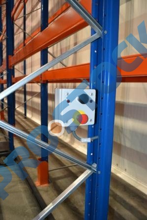 5. Система безопасности – весь доступ персонала и погрузочной техники защищён световой системой сигнализации и целиком и полностью отслеживается инфракрасными датчиками системы расположенными перед торцами мобильной системы в проходе, датчиками для плавной остановки системы (по два на крайней платформе), а также системой датчиков следящих за наличием преград при движении платформ. При пересечении таких лучей человеком или складской погрузочной техникой происходит автоматическая остановка движения стеллажной конструкции.