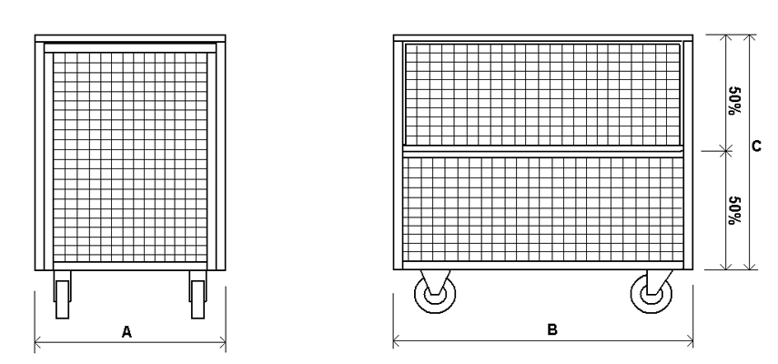Конструкция платформенного сетчатого контейнера на колесах, состоит из рамы, двух ручек, металлического настила, сетчатых бортов (размер ячейки 50х50), крышки и 4-х резиновых цельнолитых колес. Для их изготовления используют качественные материалы и комплектующие - стальная труба Ду20 (23х2,5), Ду15 (21х2,5), стальной лист (1,2 или 2,0 мм).